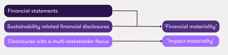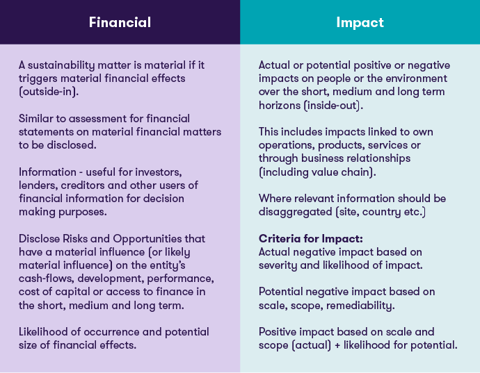 The CSRD and ESRS introduce the concept of double materiality. Entities applying ESRS must report material impacts, risks and opportunities or 'IROs' across each topical area within their sustainability statements that are both financially impactful (outside in) and have an impact to people and the environment (inside out).