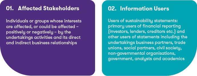 Within ESRS, stakeholders are defined as both users of sustainability statements and other stakeholders or information users. Stakeholders are those who can affect, or be affected by, the organisation and both need to be incorporated into the due diligence process.
