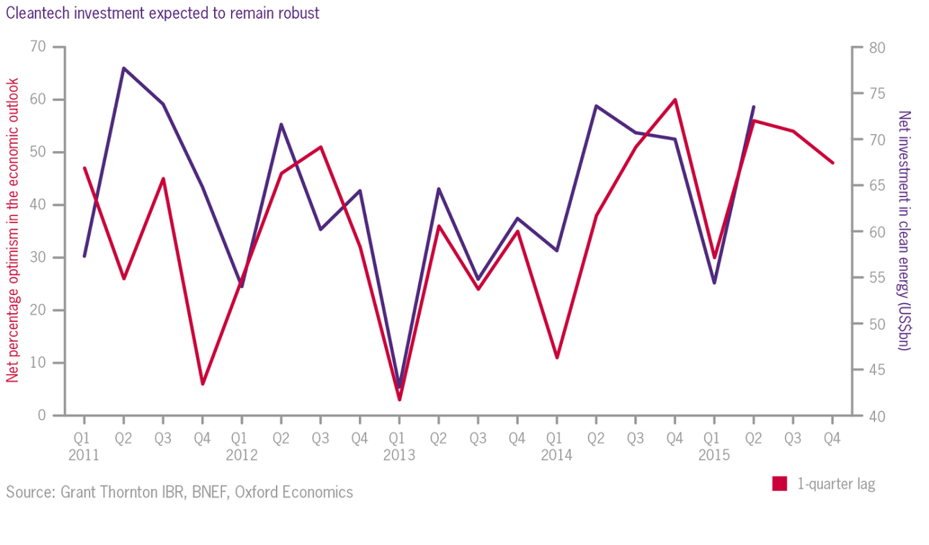 However, clean energy investment – as tracked by the Bloomberg New Energy Finance – has held up well. There may be a slight dip over the next few months if the economic confidence reading of cleantech businesses given by our International Business Report (IBR) continues to act as a good predictor of future growth (see chart). But the industry remains buoyant overall.